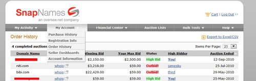snapnames.com是筆者用得最多的一個搶注工具,極其有實力,本人所有的域名均保存在moniker.com,moniker.com和snapnames.com是一家公司。前兩個月bibi.com被刪除就是被snapnames.com搶走,最后成交價20000多美元。snapnames的價格為59美元的底價,成功后直接扣款或者進入為期三天的秘密競價。