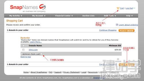 第三步:等待結果 - PLACE ORDER之后可以在My Activity中找到這個訂單,然后就是等待系統搶注了。一般com,net,org都是在晚上凌晨2點到3點左右刪除。大家完全沒有必要熬夜,直接睡覺,第二天察看郵件,如果成功了,競價去吧。如果失敗了,也會給你發一封郵件通知。不過通過whois你一般不能查到是哪個公司注冊,因為都是通過管道來注冊。