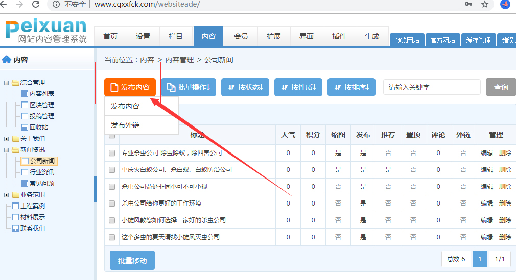發(fā)布內(nèi)容時(shí)一定要注意、增加的內(nèi)容增加在什么地方,首先要在左邊選擇增加到內(nèi)容的欄目,比如要發(fā)布新聞,首先要在左邊選擇新聞。再點(diǎn)內(nèi)容發(fā)布按鈕